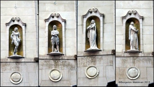 In 1927, Miller erected four statues representing women in the arts, his clientele. Drama is represented by Ethel Barrymore as Ophelia; Musical Comedy is represented by Marilyn Miller as Sunny; Opera is represented by Rosa Ponselle as Leonora; and Motion Pictures are represented by Mary Pickford as Little Lord Fauntleroy.