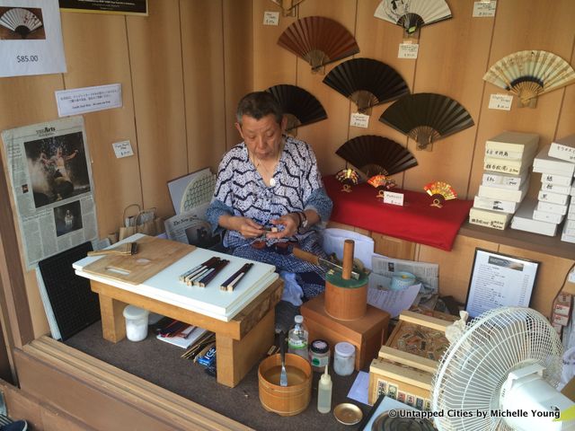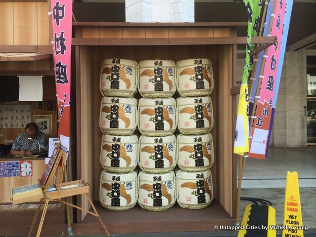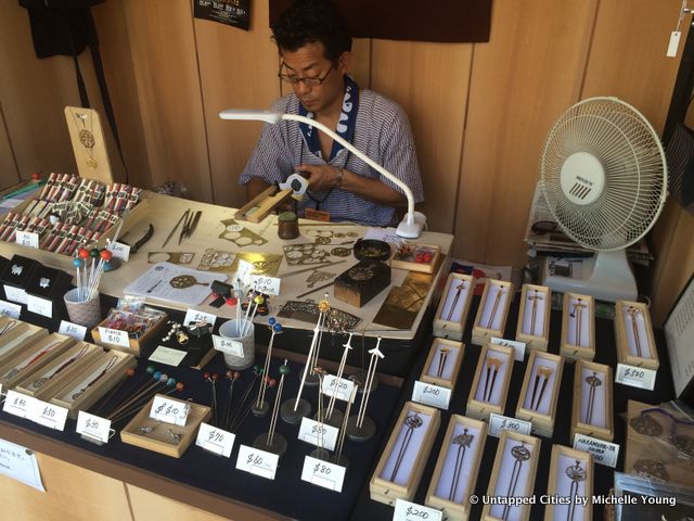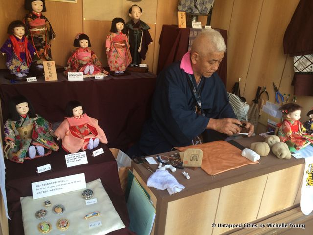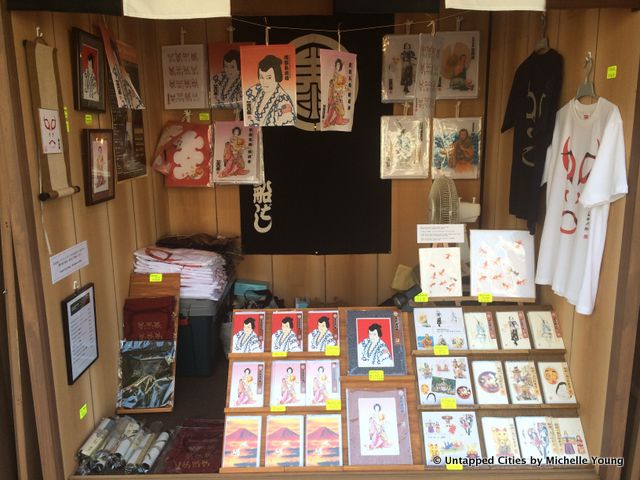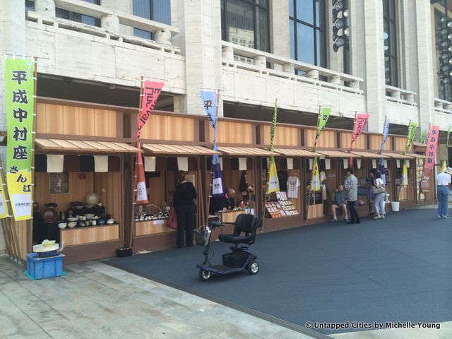 On the plaza of Lincoln Center until Monday, there’s a Japanese artisan village set up in conjunction with Heisei Nakamura-za revival of a rarely performed 19th-century kabuki ghost story at the Rose Theater. Built of wooden stalls in Japanese nagaya style—traditional bungalows built in rows–artisans are making specialty crafts on the spot. These include Nihon Ningyo (hand-painted dolls), Tenugui (fine cotton towels), Kanzashi (hair ornaments). There’s also a fun display of sake barrels.