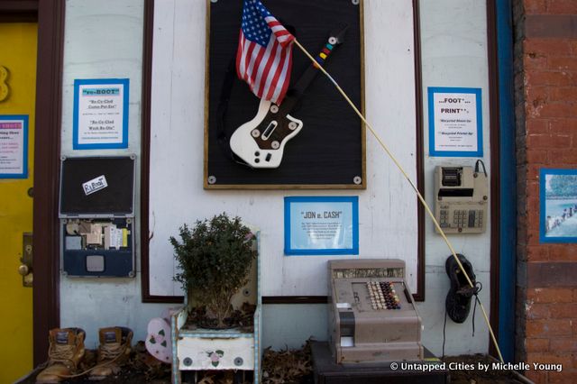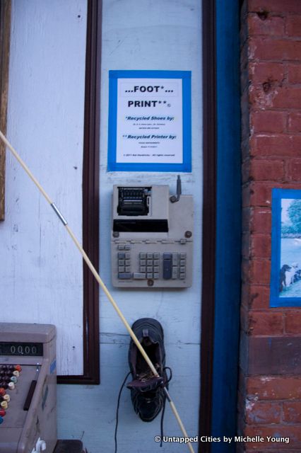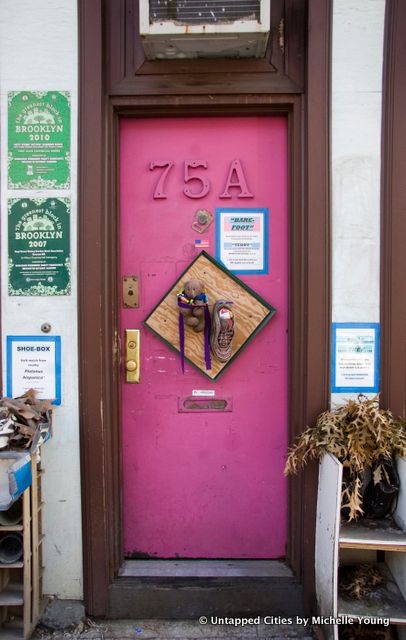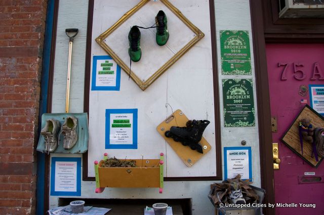 Just off of Atlantic Avenue in Boerum Hill, Brooklyn, you’ll find a quirky shoe-themed street art installation on the facade of 75 and 75A Hoyt Street. There are a combination of found objects, but most are shoes titled with puns. It’s the work of Nat Hendricks, owner of several buildings on this block of Hoyt Street, including the vintage diner, Victory Cafe, on the corner of Hoyt Street and Smith Street.