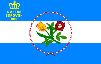 Heading down the East River, the Queens flag has three horizontal stripes, dropping the orange of the New York City flag for a blue-white-blue pattern. A ring of wampum is used to symbolize the Indians. Inside is a tulip, a symbol of the early Dutch settlers, and a white and red rose – the Tudor rose – which symbolizes the English settlers. The flag also has the date when Queens County joined the boroughs, the crown of Queen Anne and the name “Qveens Borovgh” at the top.