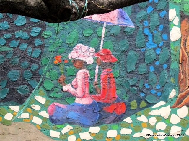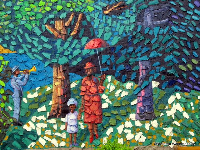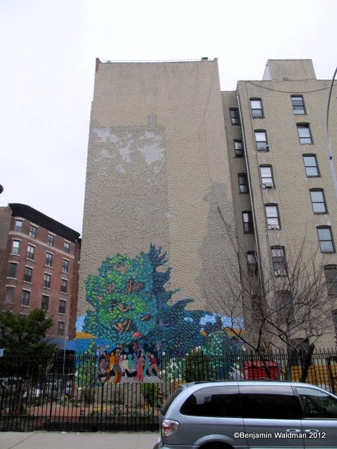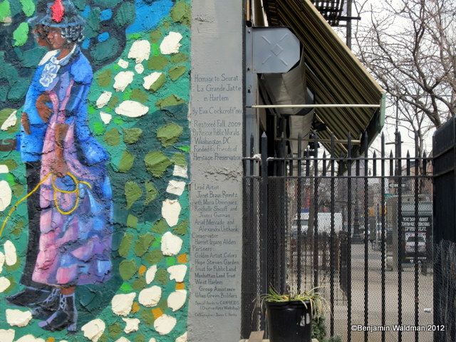 This mural is the only remaining New York City mural by Eva Crockcroft, who was an artist, art historian, and author instrumental in the national community murals movement. The mural, painted in 1986 transfers Seurat’s original to Harlem. Here, a bugler announces that it is time for church, African-Americans stroll (still with parasol in hand) and “the bold jewel tones of the Caribbean and the American South replace the soft French Impressionist palette.”