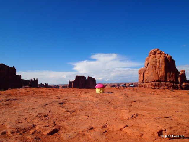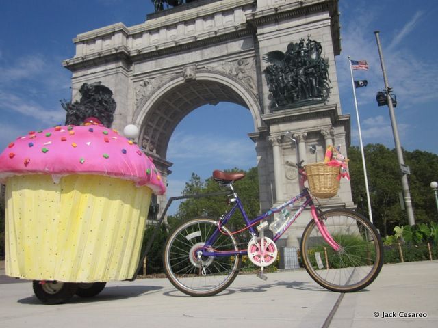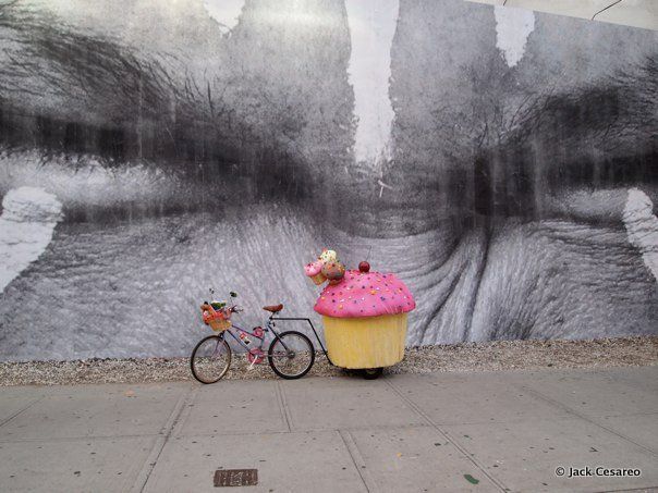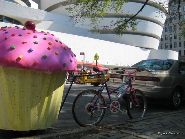Have you ever caught sight of this giant cupcake attached to a bicycle in NYC? Back in 2010, we spent some time in the studio with the artist behind it, Jack Cesareo. During our visit, we discovered two key facts: it’s an art project–Cesareo likes to photograph the cupcake juxtaposed against landmarks in New York City. And, Cesareo is an artist at the American Museum of Natural History, making models and painting diorama backgrounds. [He later gave us a great behind-the-scenes look into how the museum creates its amazing installations].