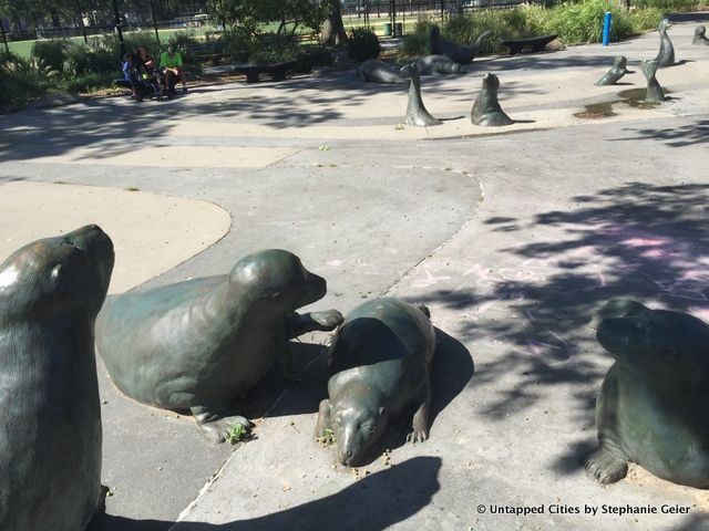 Artist Gerry Augustine Lynas, who has done freelance design in New York City since 1970 and made sculptures for five other New York City parks, designed and created the sculptures for this sprinkler area. The bronze and fiberglass seals were installed in 2001, with smaller sculptures of turtles and crabs scattered between them. This area is next to the Fire Boat House, where the East River Park Environmental Learning Center is.