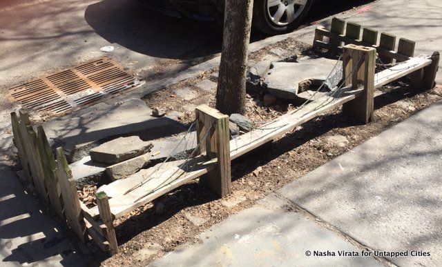A wooden miniature Brooklyn Bridge is an unexpected addition to a Cobble Hill sidewalk, showing us once again that New York street art comes in all shapes and sizes. Built out of wood, wire and some nails, the replica has, as far as we can tell, a mysterious origin.
