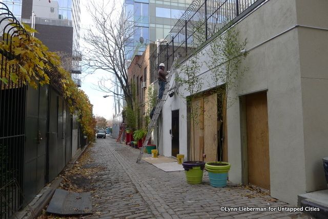 We first discovered the Pez house on Charles Lane in 2010, and it was the recent post on the little farmhouse of Charles Street that made us wonder if the Pez dispensers were still there. The townhouses, two rows of eight with small front yards and wrought iron gates, are still intact and wonderfully preserved, as is the Belgian block originally set in 1890. In stark contrast, next door to the west are a pair of Richard Meier designed glass buildings facing the Hudson River.