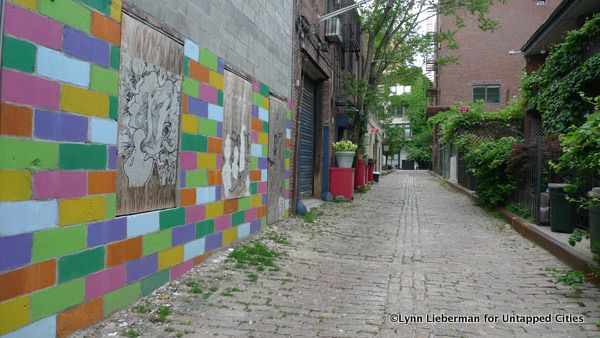 When we first visited this mews in 2010, there was a colorful painted brick mural on the east side. The mural is now gone and replaced by a plain stucco surface.
