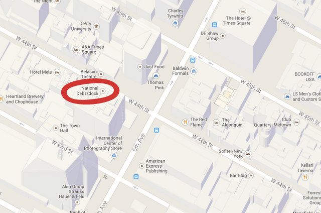 Despite popular misconception, those big numbers in Union Square do not count the national debt. The real National Debt Clock is located on 44th Street and 6th Avenue and is actually a location on Google Maps:
