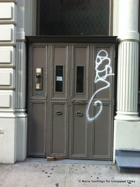 Most likely though, this is an elevator is a remnant of the manufacturing days in Soho. It just stands out because of its decorated exterior. If you look up, there’s evidence of a existing or former shaftway. Next door, you can see the outline of what was another former elevator but has been bricked up.