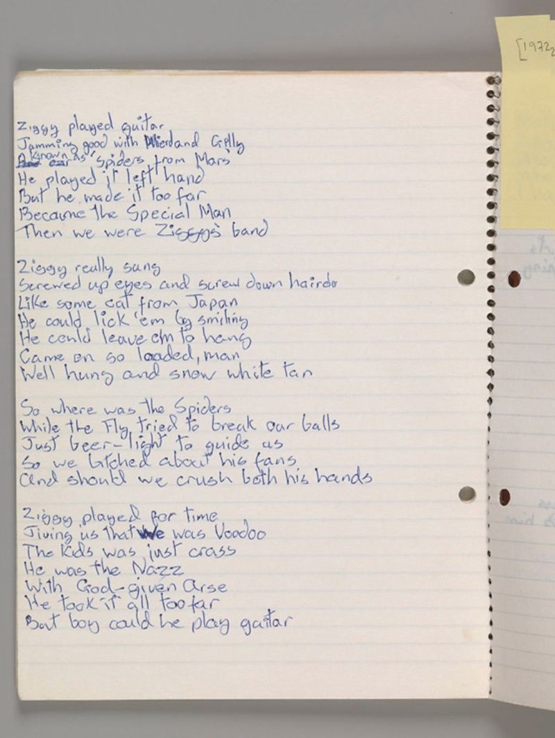 Original lyrics for “Ziggy Stardust,” by David Bowie, 1972. Courtesy of The David Bowie Archive. Image © Victoria and Albert Museum