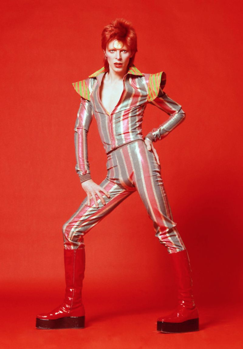 Another section of the exhibition explores Bowie’s deliberate departure from the authenticity favored by rock and roll personas, and the promulgation of a new cognizance that on stage and off stage personas could be blurred. Bowie was more than willing to dive into a full-on transformation involving stae makeup, glitter, and hair dye “to create an overtly provocative spectacle.” He added to and embraced the celebrity-obsessed culture of the 1970s.