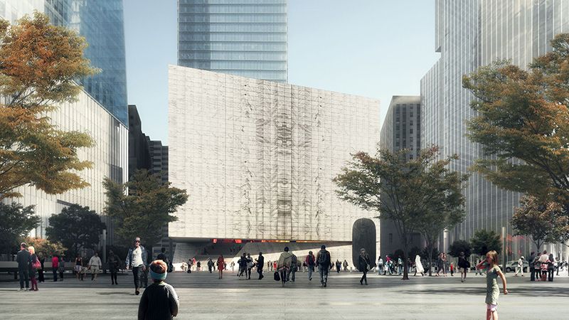 Designed by REX, the 90,000 square-foot cube-shaped building, to be called the Ronald O. Perelman Performing Arts Center at the World Trade Center, will be constructed out of translucent, veined marble, laminated within insulated glass. To match the gravity of the surrounding context, the center will appear monumental and stately in the day time. When night falls, however, it will illuminate from within, revealing the silhouettes of the people inside.
