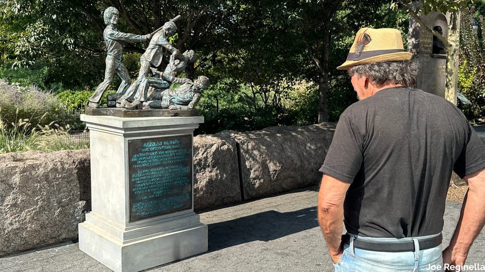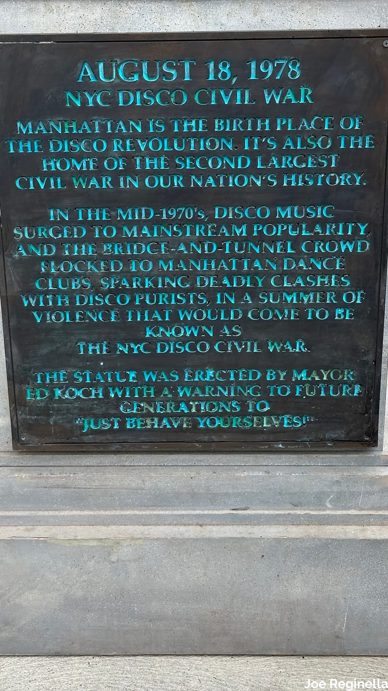 If so, you would be forgiven...because it never actually happened. The NYC Disco Civil War is the latest fake historical event to be memorialized in sculpture by Staten Island-based artist Joe Reginella. Reginella is known for his series NYC Urban Legends, of which this is the seventh installation.