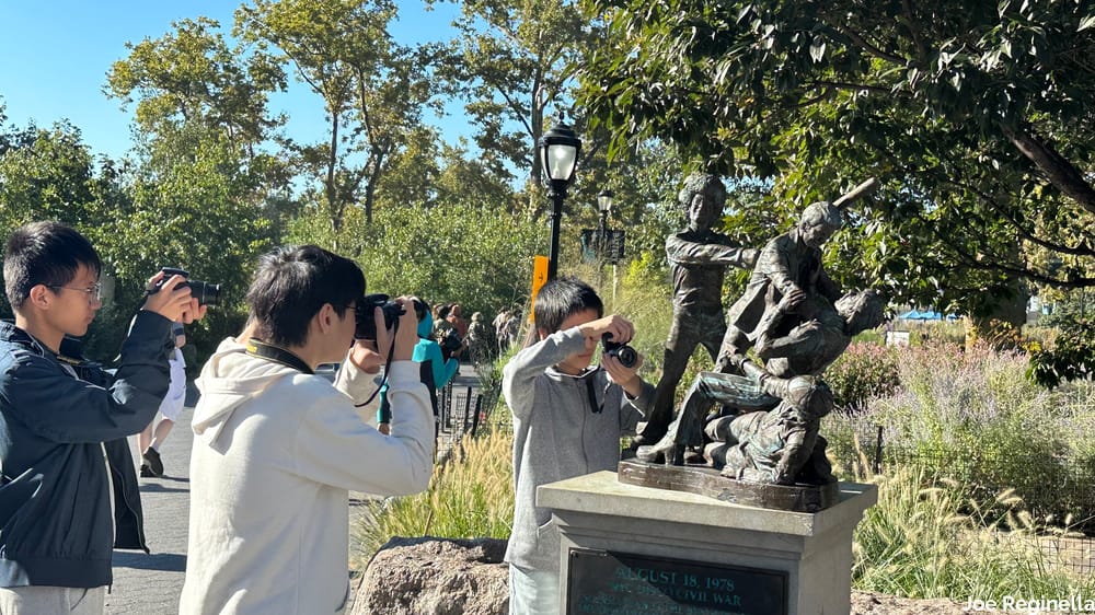 Reginella crafts each piece in his Staten Island studio (which Untapped New York members got a virtual tour of in 2023). He first sculpted each individual figure out of clay, then put them together to make a mold and cast them. In the end, the work comes together in four pieces: three parts make up the base and the sculpture sits on top. It all comes apart to fit onto a cart that Reginella uses to transport the work from his studio to the ferry and finally to The Battery in Manhattan for display.