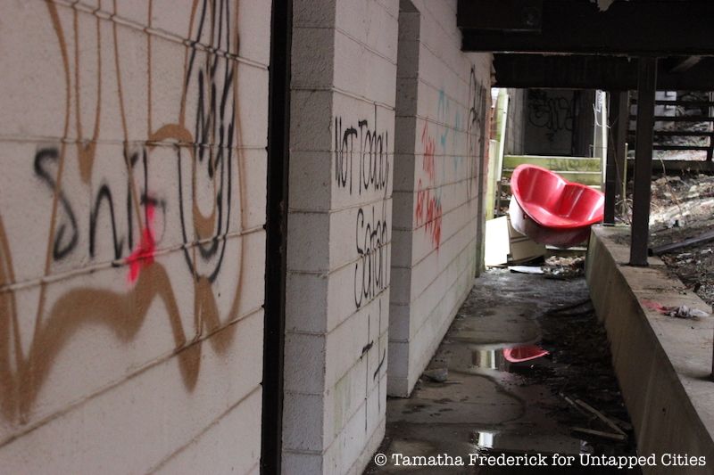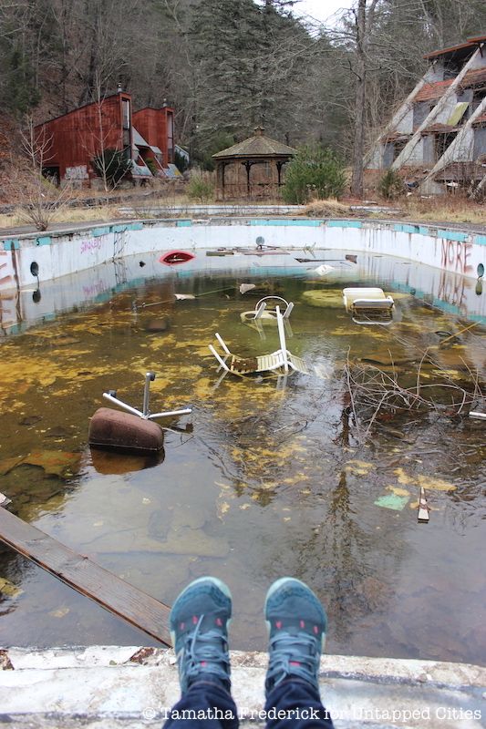 Visitors these days won’t find any of the retro glitz and glamor that was once associated with Penn Hills Resort. The pool is a green murky mass with random pieces of furniture stirred in for good measure. Most of the red heart shaped tubs have been cast from their slashed rooms. The mirrors are in pieces, insulation pulled from the walls, and the usual graffiti abounds.