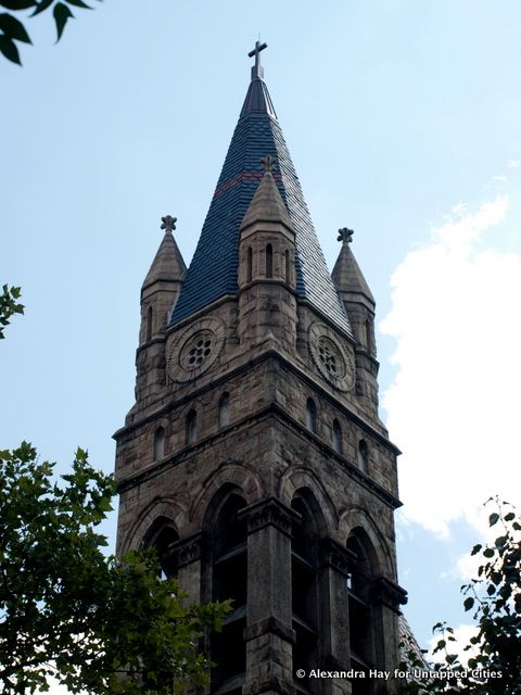 The Gothic Revival St. Andrew’s Church, built in 1873 and enlarged in 1890, looks like it was carved out of one of upper Manhattan’s rocky outcroppings. Its rock-face granite walls give it a rugged, solid look, but the clock tower, unusual because it is set back from the corner, is relatively slender, topped by a spire covered in slate.