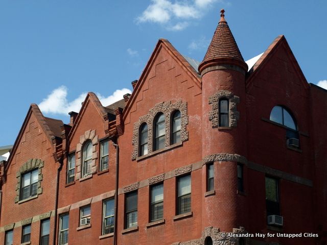Sticking with the late nineteenth-century brick theme, 2068-2076 Fifth Avenue has large gables and the added bonus of a rounded turret on the corner–a castle-like flourish on this brick and brownstone group of row houses.