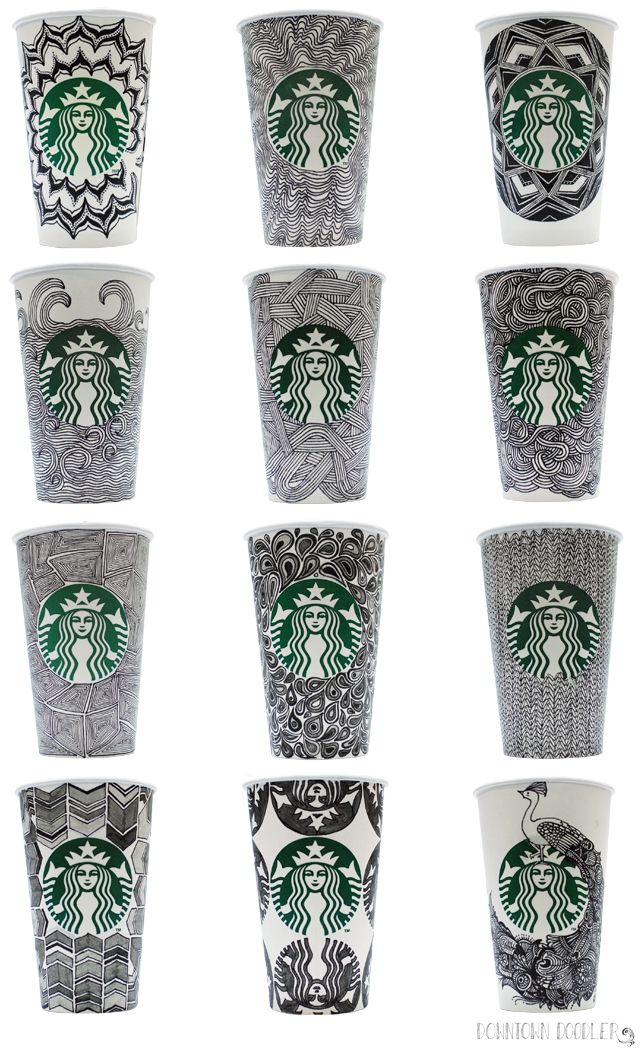 It’s been about a year since my first Grande Doodles Starbucks cup post went viral on Tumblr, and in that time I accumulated about 40 empty cups and 12 new doodles. I took inspiration from people I follow on instagram, ceramics, patterns, and a few are just me experimenting to see what would happen. My last post had 12 cups, and so does this one. Enjoy the new set of cups! Buy them as prints on Society6 or as individual cups on Etsy.