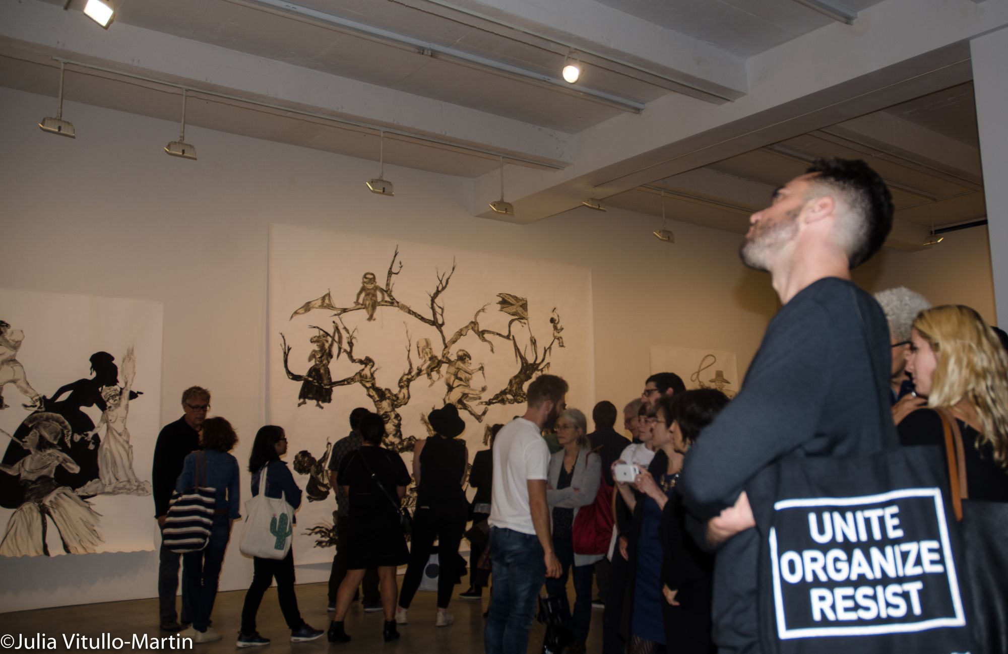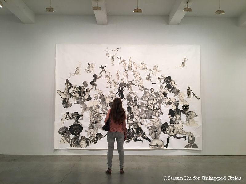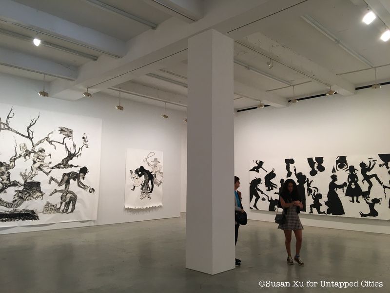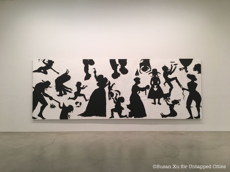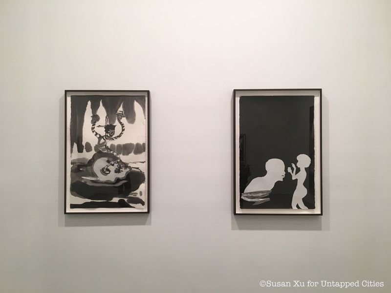 So brutal and ugly are the characters in her ink drawings, viewers at the September 7th opening mostly stared silently. Paintings, collaged drawings and Walker’s iconic silhouette cut-outs come together on paper, displaying images of figures being lynched and chained, an arm raised in a Nazi salute and a head displayed on a platter.