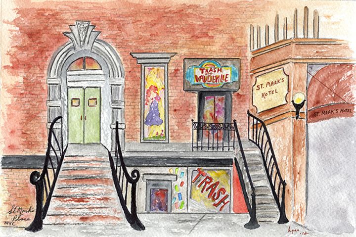 4 St. Mark’s Place houses the eclectic clothing store known as Trash & Vaudeville. My painting shows the many layers of watercolor life this shop breathed into the East Village in the 70’s and 80’s and continues to inspire and bring pizazz into the lives of the young and young at heart today.