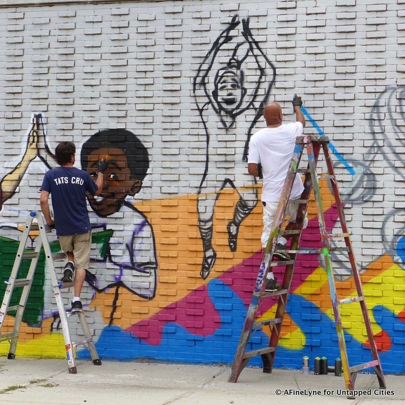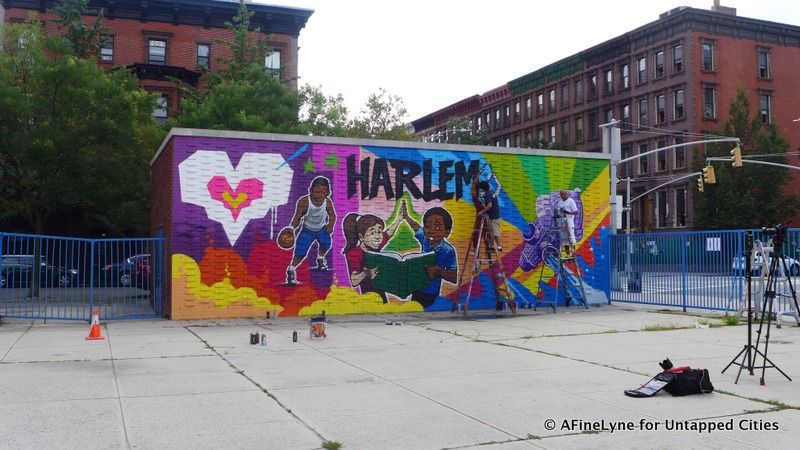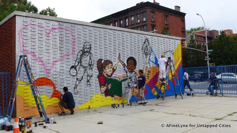The program, which began in April, will conclude with fifteen murals, each expressing the importance of education, and respect for human rights and religious freedom. Untapped Cities will bring you all the murals in our September Outdoor Art Installation Roundup at the end of this month. But here is a preview of one of the murals, painted this week by TatsCru, which is located at 2005 Madison Avenue at 127th Street in East Harlem.