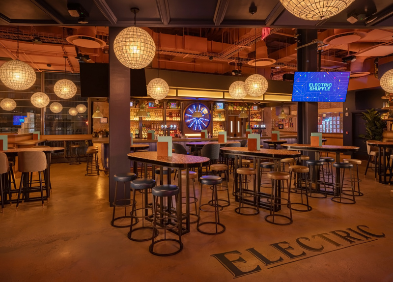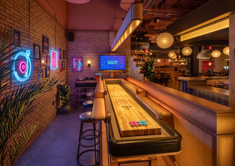 In addition to the high-voltage gameplay happening at the shuffleboard tables, the bar offers a full menu of shareable bites and creative cocktails. Sip on a Salted Caramel Espresso Martini or a Spicy Lucy margarita (featuring in-house jalapeno-infused tequila made daily) while munching on wings and Truffle Parmesan Fries. Decor elements like a pink staircase, glittering gold disco balls, and a color-changing, neon turbine wheel inspired by vintage power stations—a signature across all Electric Shuffle locations—create a playful yet cozy atmosphere.