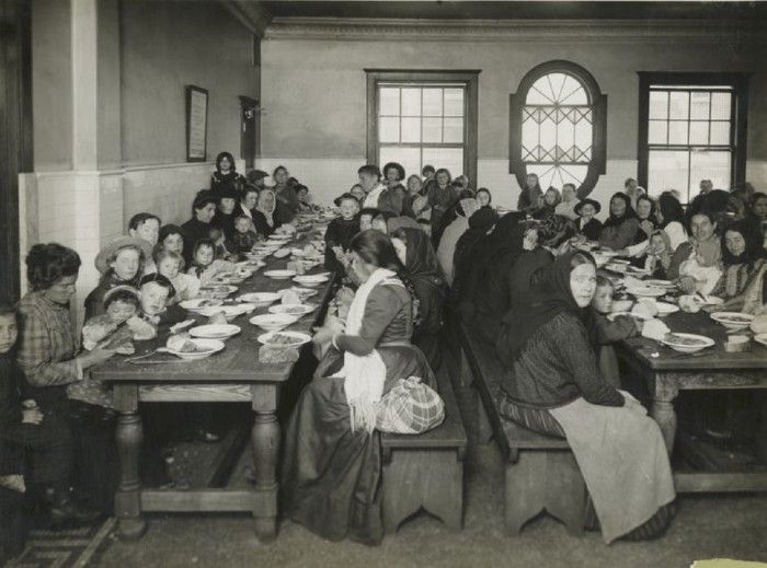 Upon arrival, immigrants were served meals in a dining hall. Image from New York Public Library