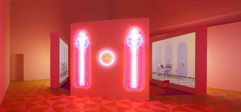 Alex Da Corte (b. 1980) with Jayson Musson (b.1977), Easternsports, 2014. Four-channel video, color, sound; 152 min., with four screens, neon, carpet, vinyl composition tile, metal folding chairs, artificial oranges, orange scent, and diffusers. Score by Devonté Hynes. Collection of the artists; courtesy David Risley Gallery, Copenhagen, and Salon 94, New York. Installation view, Institute of Contemporary Art, University of Pennsylvania, 2014. © Alex Da Corte; image courtesy the artist and Institute of Contemporary Art, University of Pennsylvania.