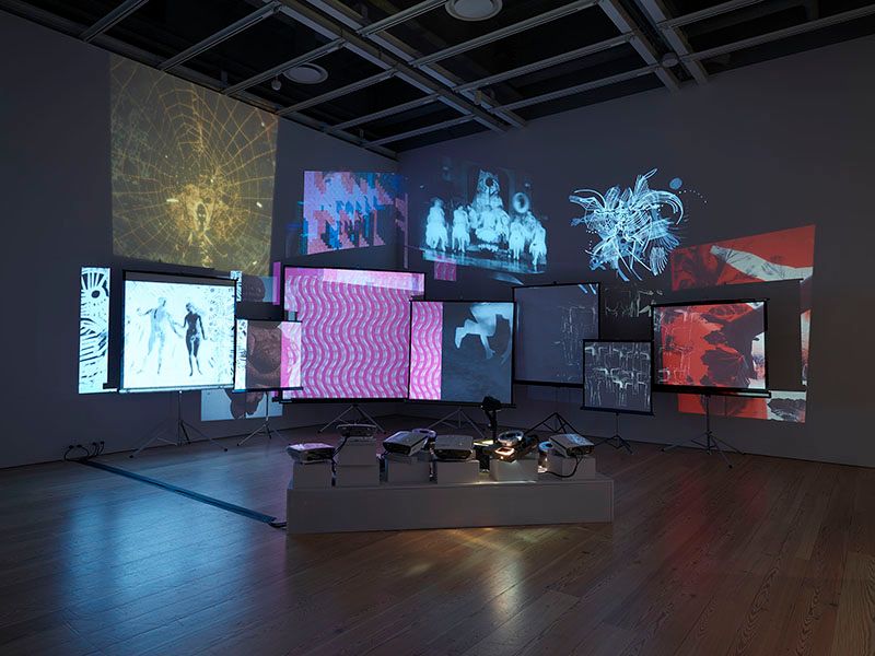 Installation view of “Dreamlands: Immersive Cinema and Art, 1905-2016” (Whitney Museum of American Art, New York, October 28, 2016-February 5, 2017). Stan VanDerBeek, Movie Mural, (1968) E.2016.1545. Photography by Ronald Amstutz.