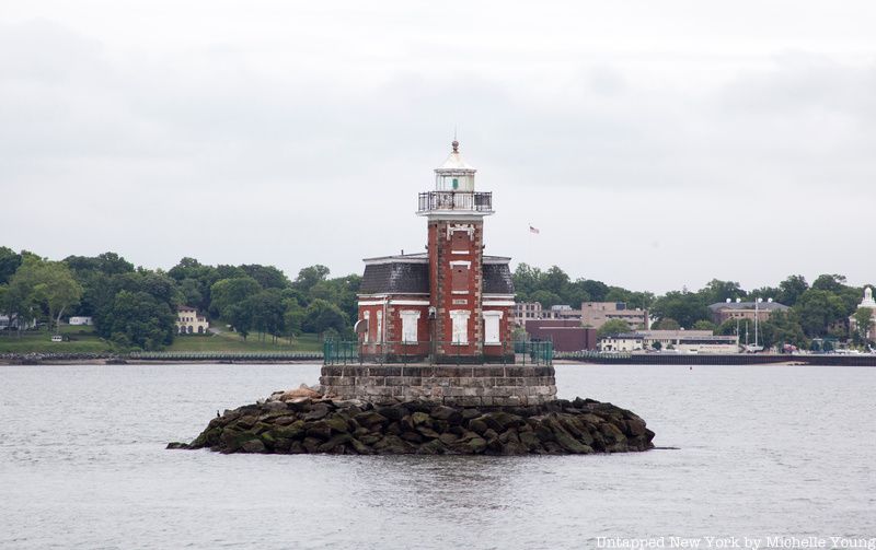 The Esopus Meadow Lighthouse is quite possibly the most adorable lighthouse along the Hudson River. All of the lighthouses have their own distinctive architectural style, but the Esopus Meadow Lighthouse, located south of Kingston, is the only one that survives in a wood-frame Georgian Colonial style (albeit with a French-style mansard roof on top). Green shutters that actually open and close (unlike those on many suburban houses) form a nice color contrast to the white clapboard façade and red roof. A turret emerges from the center of the roof, where affixed in red is the year 1871 — the year the Esopus Meadow Lighthouse began construction. The lighthouse tower ends on an octagonal deck that once housed an optic fifth-order Fresnel lens whose beam could be seen for twelve nautical miles.
