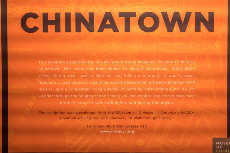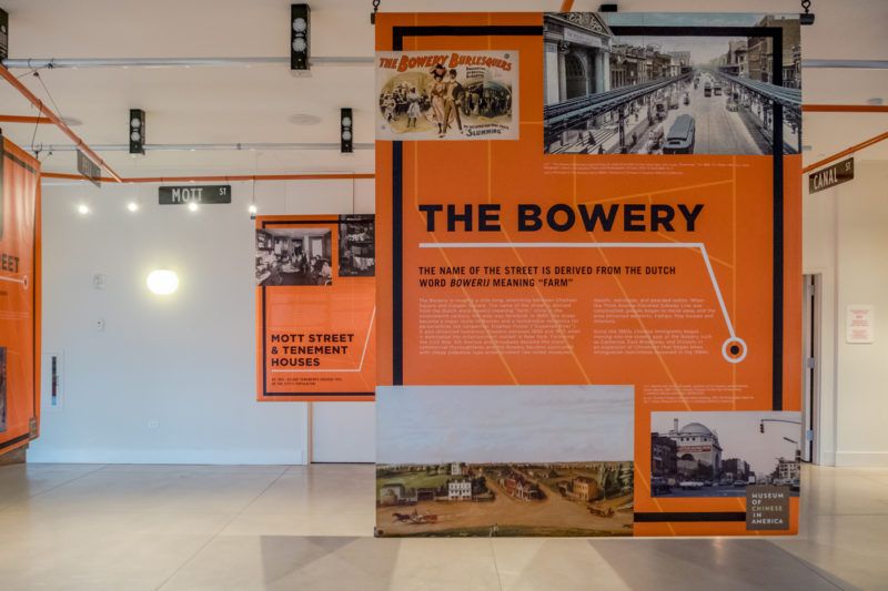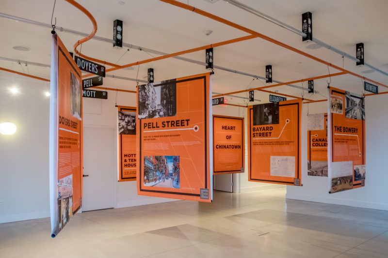 Inside the exhibit, you’ll see multiple panels about the history of Chinatown’s main streets, from Bowery to Canal street and Doyers street. These panels hang from a framework of orange pipes with actual street plates to mimic the streets themselves.