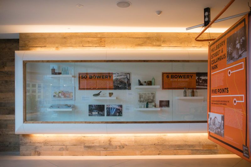 The exhibit also takes visitors back in time with its display of original bottles from the Olliffe Apothecary, which once stood nearby at 6 Bowery. Even the brick wall at the hotel lobby pays tribute to the Boweryâs history, with its protruding bricks from the basement of the Atlantic Garden, some of which was archaeologically recovered.