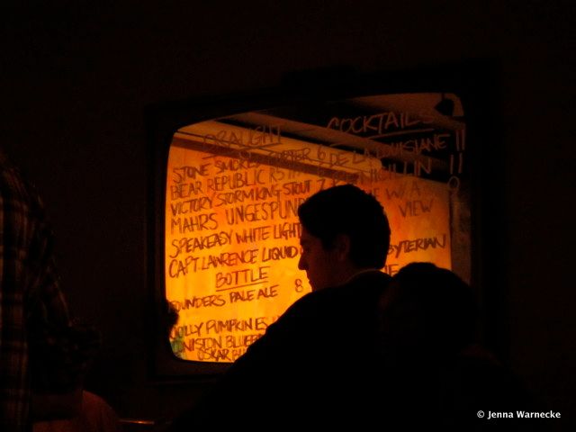 From the ceiling (constructed from the wood floors of a Catholic school in Virginia) to the trio of massive windows, formerly garage doors, facing the street (which feature what Ricke calls “a natural moving installation” in the ever-moving BQE beyond) to the enormous Brendan Smith painting that anchors the bar and gives a quiet glow to the bartenders’ silhouettes before it, each asset of the bar has been utilized to maximum effect. Even the custom wooden taps on the beer draught come from the same wood as the bar top itself. What emerges is a space that feels both cool and comfortable, and altogether unpretentious.