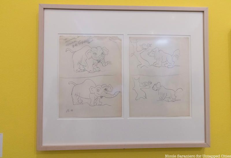 A sweet section of the exhibition shows a piece of paper with drawings done by Goldberg and his granddaughter alongside a photo of the pair. Jennifer George, Goldberg’s granddaughter, reminisced about how she would sit with her grandfather and he would draw something for her to copy. George took up the charge of caring for her grandfather’s collection when her father, Goldberg’s son, died. Her father was in the process of creating a coffee table book which she completed. The book, The Art of Rube Goldberg, contains seventy-five original drawings and sketches.