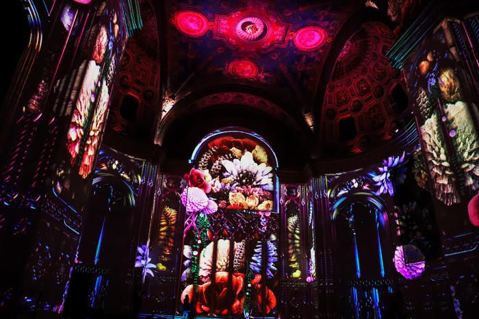 The Great Hall was once the ticketing lobby for the Cunard cruise line. The walls and 30-foot vaulted ceiling are adorned with nautical ornamentation from painted maps to sculpted sea creatures. In order to transform the space, these architectural features have been digitally scanned and projection-mapped in 360°. Half of the 12,000 square feet space features mirrored flooring that reflects vaulted ceiling above to completely envelope guests in the experience.