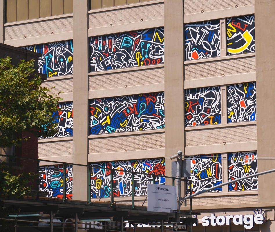 The artists were tasked with embodying Hudson Square’s legacy of creative energy into a series of dynamic displays. The result is an array of highly distinct and impactful pieces throughout Varick Street, one of the neighborhood’s central pedestrian boulevards. Along the route, pedstrians will see a mural on 200 Varick inspired by the district’s printing roots by Greg Lamarche, a quilt-like design on 131 Varick’s façade by JMikal Davis, hieroglyphs-style patterns on 61 Varick and 181 Varick by Brooklyn artist Katie Merz’s and a sculptural piece made up of 5,000 pieces of neon-colored acrylic by Claudia Ravaschiere and Michael Moss.