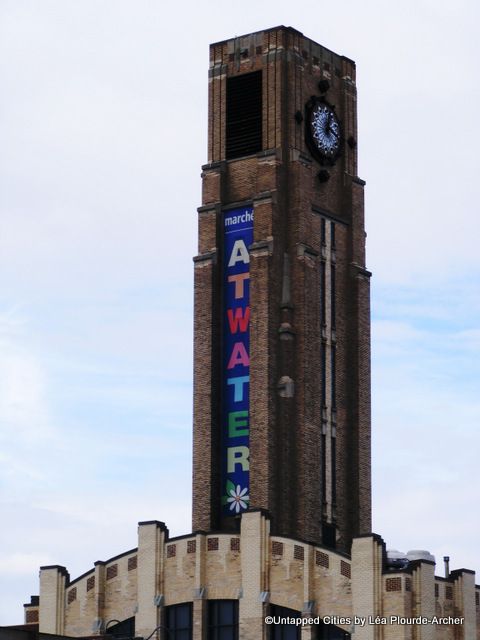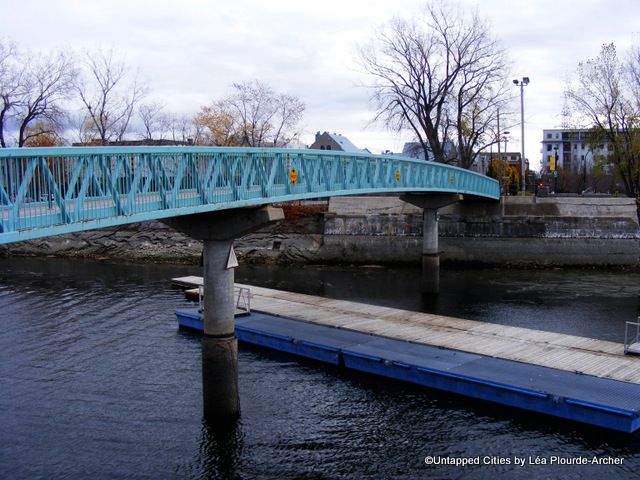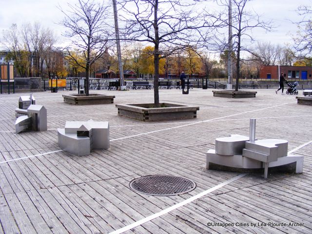 Art has also been incorporated more officially into public spaces in Little Burgundy. The Art Deco Atwater Market building, selling fresh produce and meat since 1933, is located right on the edge of the Lachine Canal, a popular spot for cycling trips and summer picnics. On a terrace between the market and the water’s edge, there is an installation by Montreal-based Polish artist Jacek Jarnuszkiewicz. Each of Les Allusif‘s eight stainless steel sculptures refers to one aspect in the surrounding neighborhood’s history, partly focusing on its musical heritage (represented by two side by side pianos facing opposite ways).