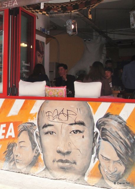 Some restaurants are tall and narrow, making full use of space by extending their seating area to the balcony. Others are short and compressed, with tables and chairs spilling out into the streets. All are colorful, although not in a tacky way. Somehow, baby blue matches well with hot pink or lipstick red. Moreover, Itaewon graffiti is high-quality art. Portraits of people’s faces spray-painted on garage doors and brick walls are rather life-like.