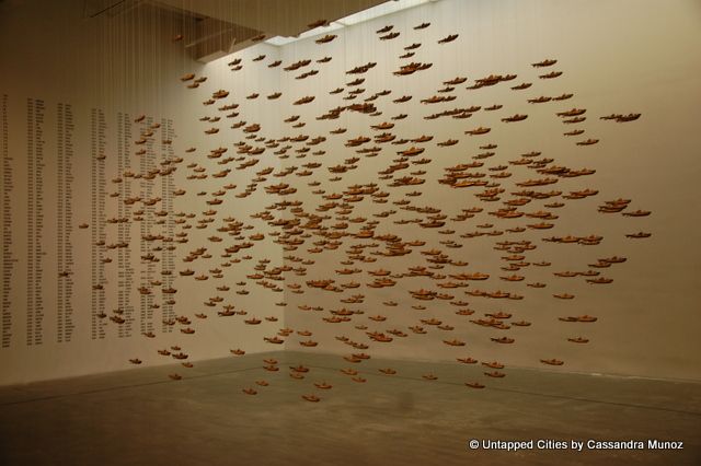 Chris Burden first became known in 1973 for his performance piece entitled “Shoot,” in which viewers watched as Burden was shot in the arm by a friend, using a 22 rifle. His other works during that time revolved around the idea of personal endangerment as an artistic experience. In the 80’s he moved towards installation pieces, partly because the performance pieces were beginning to take their toll on his body. Burden taught at the University of California Los Angeles from 1978 to 2005, leaving after a dispute caused by a student bringing a gun to school. More recent Chris Burden works include an enormous city of cars called Metropolis II. The piece, which took Burden four years to complete, includes 1,100 toy cars moving at speeds of up to 240 mph. Like many of the Burden works on display at the New Museum, it leaves us wondering at the technological and political limits of the world around us.