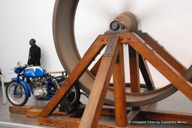 The most glitzy item, the golden Tower of Power, sits illuminated behind closed doors. In order to view it, visitors must place their bags in a locker before they are escorted to the four million dollar inquiry on the value money. The fourth floor of the New Museum is the temporary home of Burden’s 1979 piece The Big Wheel. It combines a motorcycle with a three ton flywheel that is set spinning by furious peddling or the revving of the engine. A quiet hum presides over the other installation in the room, a massive beam balance holding a Porsche on one side and a meteorite on the other. Our personal favorite is “Beam Drop,” which is a video that builds up the tension of 60 I-beams being dropped into a pool of wet cement bringing into feature the brutality of the act .