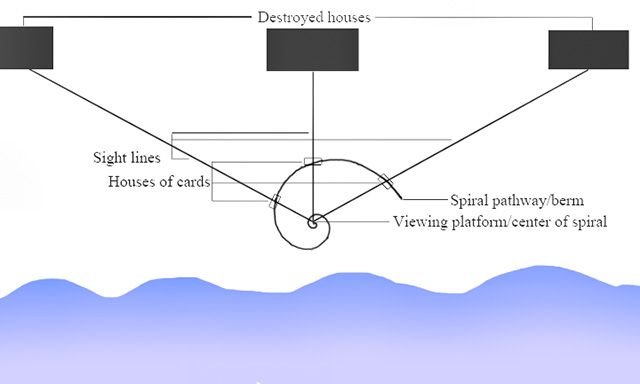 Letting go of my expectations was very challenging but tremendously enriching personally as well as creatively: it all came together. In our preliminary discussions we had decided on siting the piece in the Beach 130s: the unreal scenery of eviscerated homes was a perfect setting for the sculpture. Their violently exposed interiors gave an inarguable sense of how fragile and subservient we are to the forces that truly rule our planet.