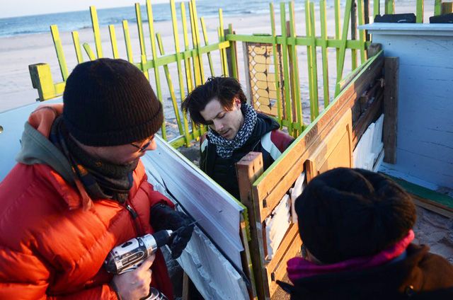 We rode the train home together and agreed to meet early the next day at the van, which we parked in the Roackaways overnight. The next morning we finished building the panels, painting certain ones green and others blue for visual effect. The paint dried while we ate lunch and warmed up ”” the beach in early January is COLD! This gave us a much-needed respite to gather our energies for the final push: we had until 5pm (sunset) that day to erect the project and get pictures of it. My other team members made a flyer and passed it out to the businesses along Beach 116th street, the hub of the Rockaway community. Time was slipping through our fingers and I began to get nervous that we wouldn’t have enough time to join the panels together and put up the piece. We raced back to B138 and began to furiously construct the sculpture, the entire piece on its side in the sand.