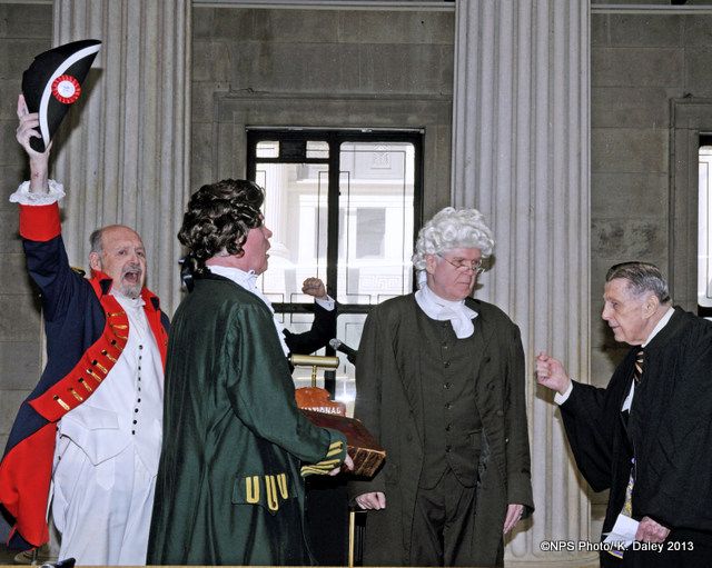 This yearâs reenacment began with welcoming remarks by representatives from the National Park Service and the Masons, who were followed by an invocation from Bishop Samuel Provost. Then the festivities began. A costumed color guard marched through the rotunda followed by a drum and fife group which played Yankee Doodle Dandy. The Pledge of Allegiance was recited followed by the first stanza of the National Anthem, which was written by Francis Scott Key, a Mason. Another drum and fife group led representatives from the St. Johnâs Lodge No. 1, AYM, in their dressed in the Masonic regalia. Along with them came the inaugural bible.