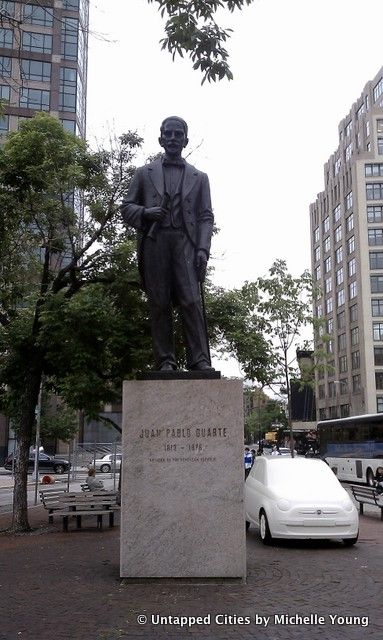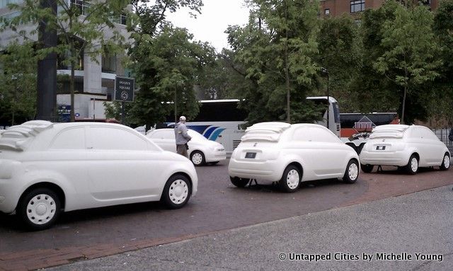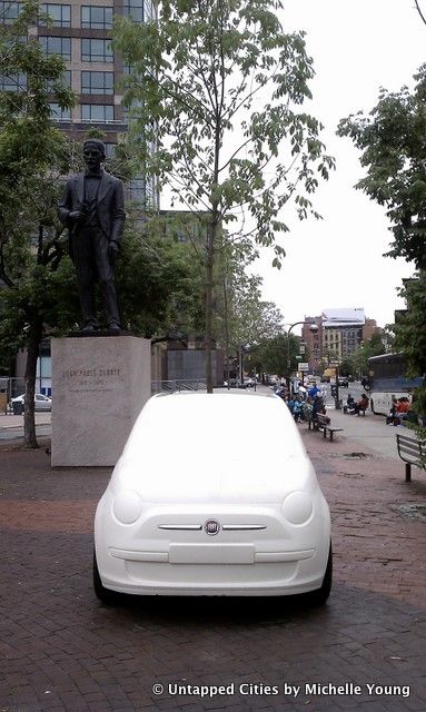 As part of MillionTreesNYC, Fiat North America planted 12 pear trees inside models of the Fiat 500 Cabrio at Juan Pablo Duarte Square on Canal Street and 6th Avenue. The installation was also timed to mark the opening of the new Fiat Gallery at 18 Wooster Street. The trees will be planted once the exhibit ends. Juan Pablo Duarte was one of the founding fathers of the Dominican Republic and other dedications of him are up in Washington Heights, near Lou Gehrig’s New York Public Library.