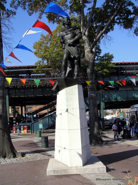 The statue was gifted to the City in 1869 and was supposed to be placed in Central Park under a protective glass housing. It was possibly erected Central Park for a time but was then removed and forgotten. In 1934, the statue was discovered in the 97th Street maintenance yard in Central Park. It was then erected in Columbus Park in Chinatown, where it remained until 1971 when it was reinstalled in Brooklyn’s Columbus Park.