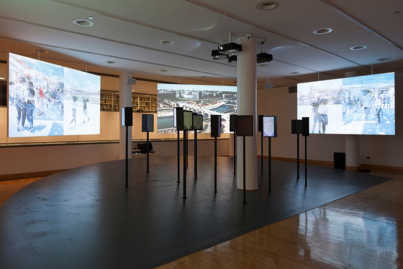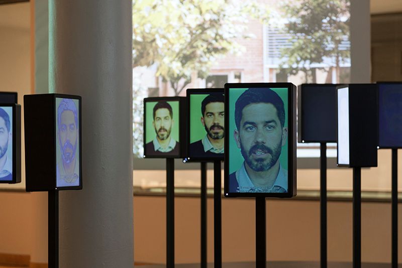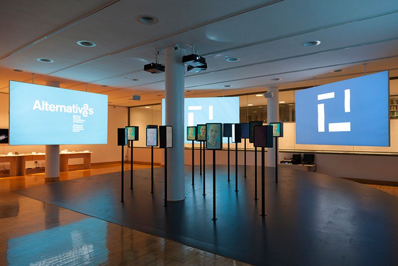 Unlike traditional exhibitions, where viewers are forced to stand a certain distance away from the featured works, Alternativas / Alternatives is entirely hands-on and interactive. Upon entering the room, your eyes will immediately focus on faces projected on a series of small screens, which are erected on poles rising from an inclined platform. Four larger displays, depicting a slideshow of buildings and structures, form a semi-circle around this area – undoubtedly the focus of the exhibition.