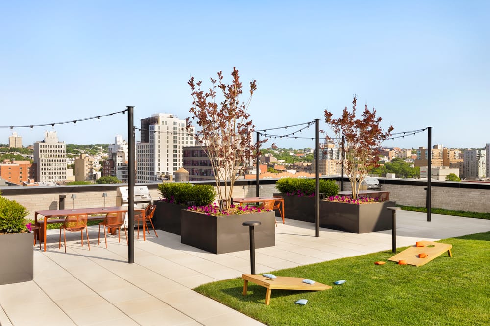 Residences inside the 10-story building range from studios to two bedrooms. Each spacious rental features an open-concept layout with high-quality finishes such as five-inch wide plank floors, white oak cabinetry with satin nickel hardware, and Caesarstone countertops, all thoughtfully chosen by Brooklyn-based CL-OTH Interiors. Many of the rentals even come with a private outdoor space.