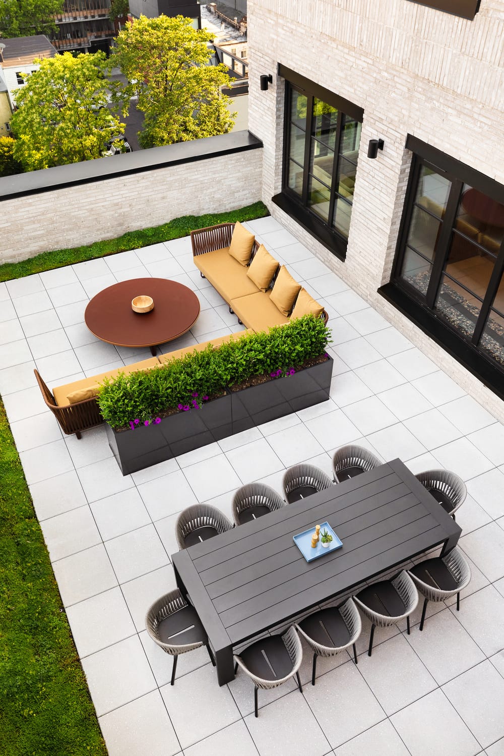 Up on the private 9th floor, residents can work, relax, or entertain in shared lounge spaces. A private dining room opens onto a landscaped terrace with grills and outdoor seating—perfect for hosting dinner under the stars.