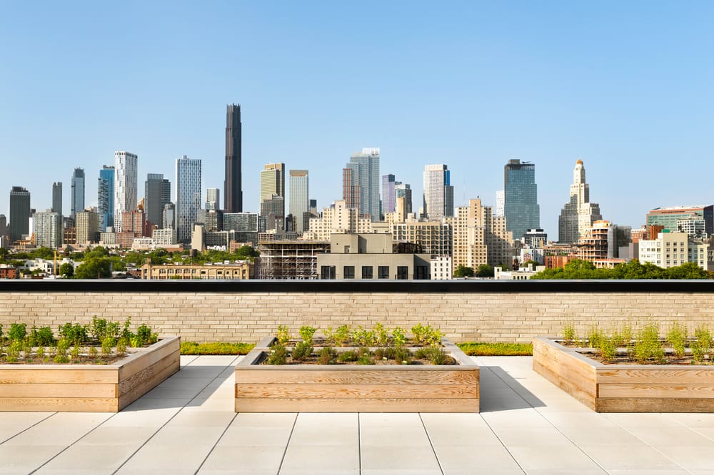 The crown on top is the rooftop where residents and their guests can take in stunning views of Brooklyn and Manhattan while enjoying a community garden, more outdoor dining space, and a swimming pool lined with cabanas.