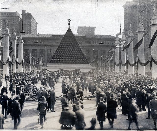 Five avenues west of the United Nations is Park Avenue, today the home of Grand Central Terminal and a slew of corporate headquarters. In 1919, it was the home of two enormous pyramids made of German army helmets. 85,000 German army helmets, to be exact. After the Allies won the First World War, American soldiers captured the helmets in a supply depot in Europe and brought them back to the States. Then the American government displayed them outside Grand Central Terminal to convince New Yorkers flush with pride to buy war bonds. German helmets were also awarded as prizes to government workers who successfully sold the bonds.