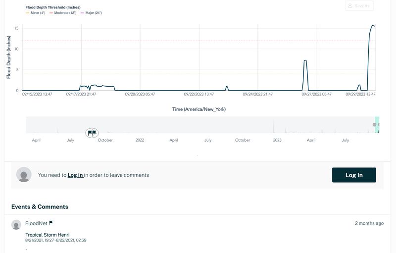 When you click on a sensor dot, more data becomes available. You can see a photo of the area where the sensor is installed along with a chart that shows recent flood depth measurements. Scrolling down, information on past flooding events is revealed.